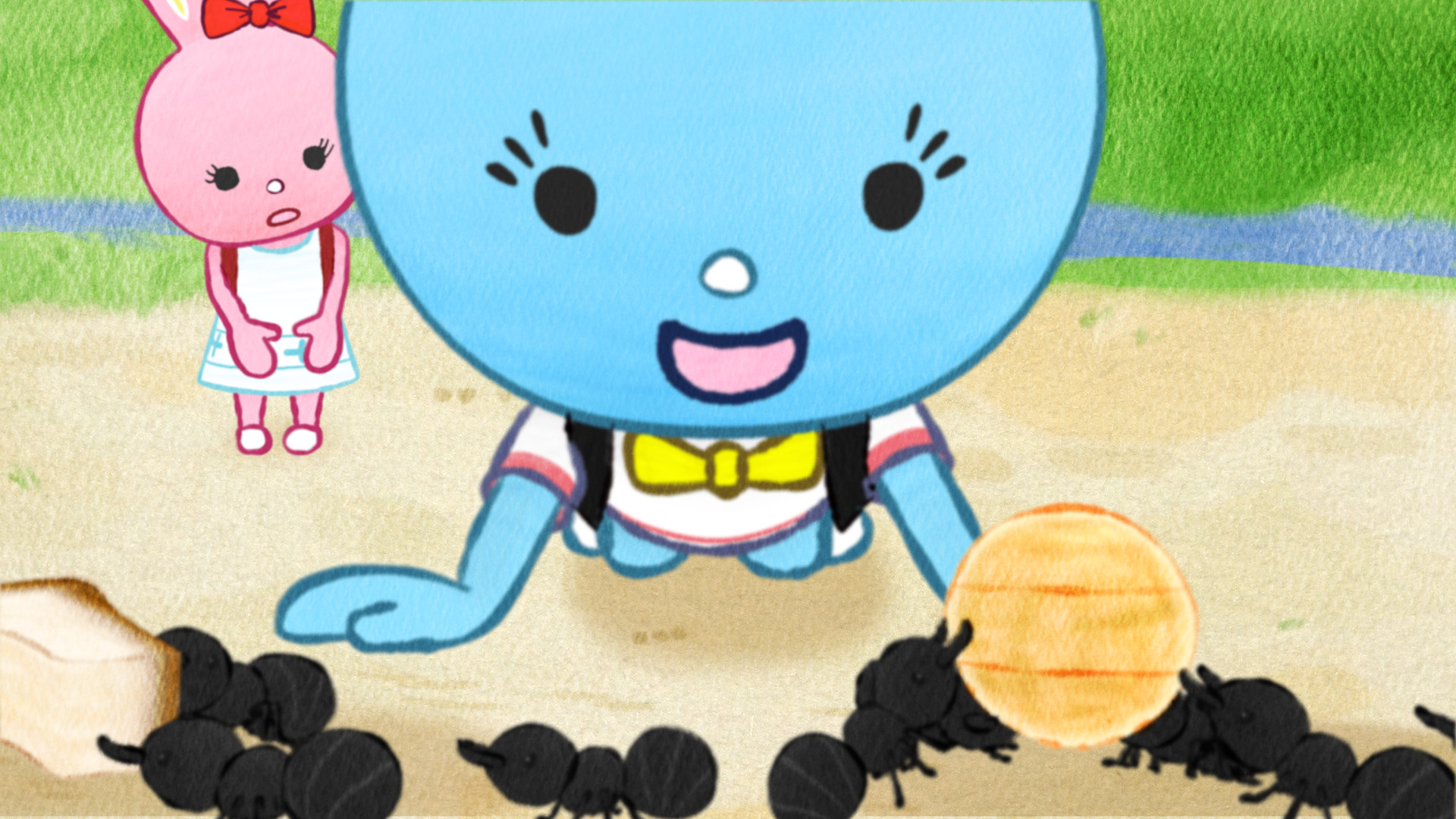 マルタが夢中になって蟻の行列を見ている横を、お友達のモンキチ、ムーちゃん、トム、オックが登校していきます。みんな心配そうです。