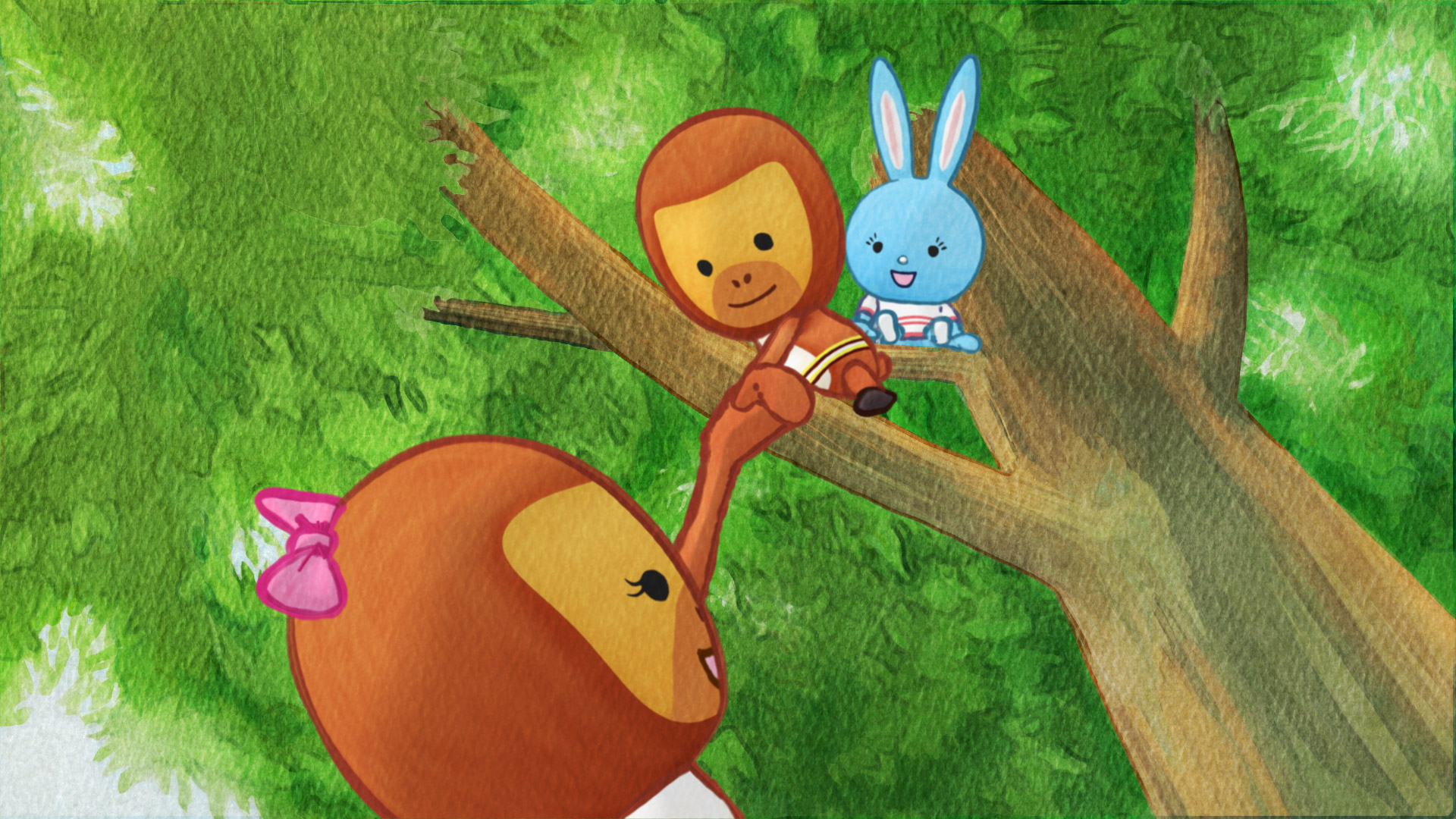 木登りの苦手なモンキチがブニョの木の前に立っています。 なんだかにらめっこをしているみたい。どうやら苦手な木登りに挑戦するみたいですね。